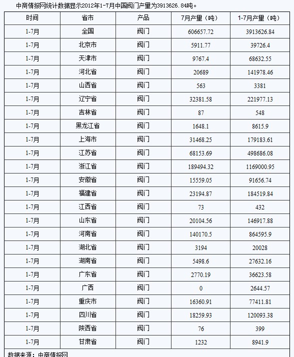 2012年1-7月中國閥門產(chǎn)量數(shù)據(jù)統(tǒng)計(分省市)